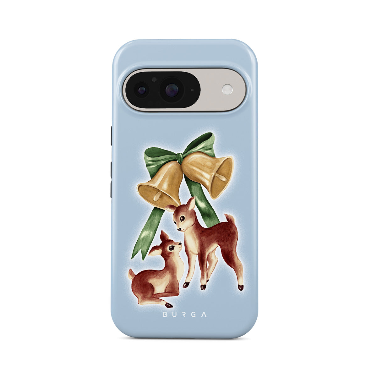 En este diseño: reno vintage, campanas de Navidad, campanas doradas, ilustración retro de reno, ciervo bebé, fondo azul claro