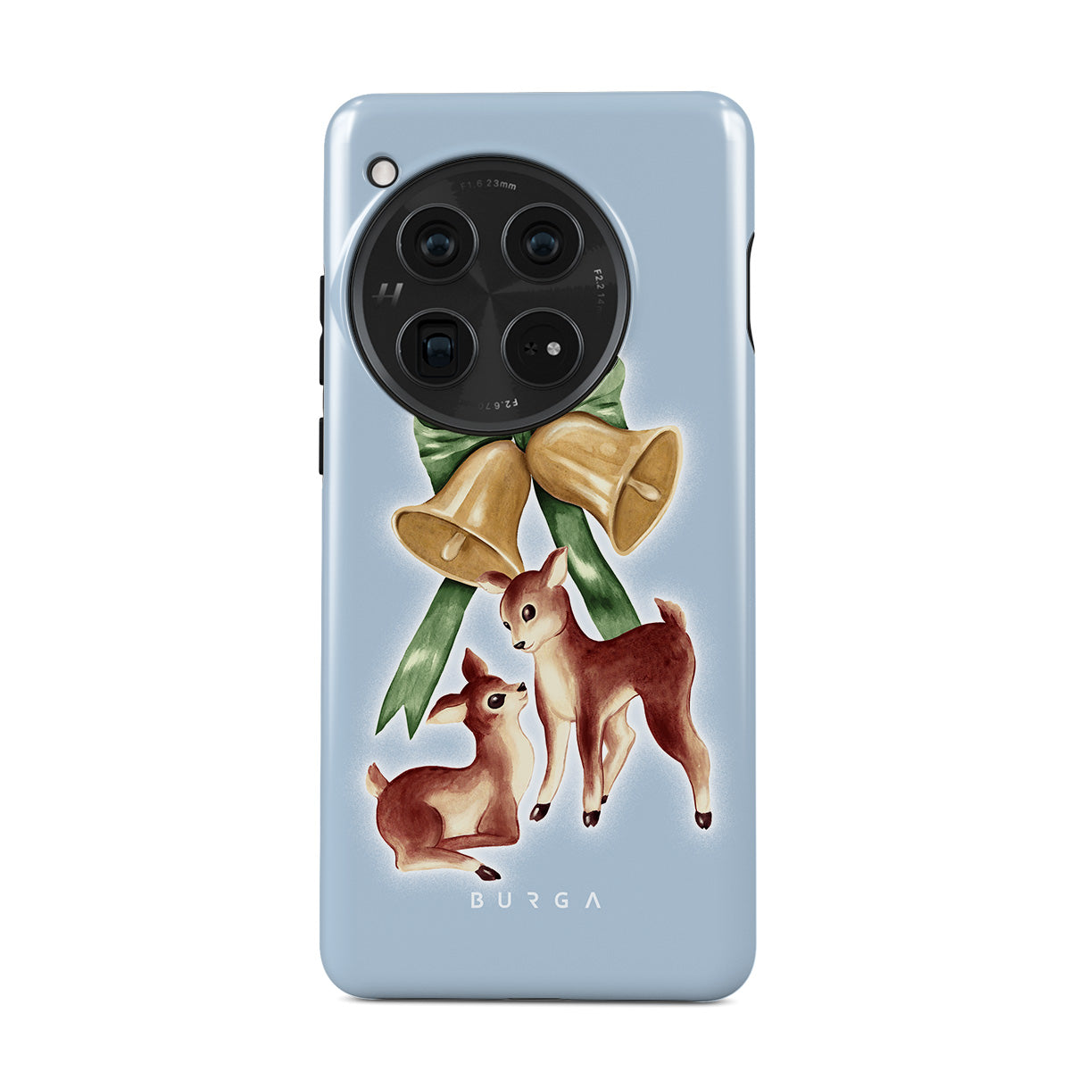 En este diseño: reno vintage, campanas de Navidad, campanas doradas, ilustración retro de reno, ciervo bebé, fondo azul claro