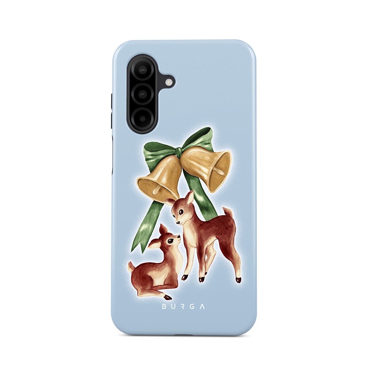 En este diseño: reno vintage, campanas de Navidad, campanas doradas, ilustración retro de reno, ciervo bebé, fondo azul claro