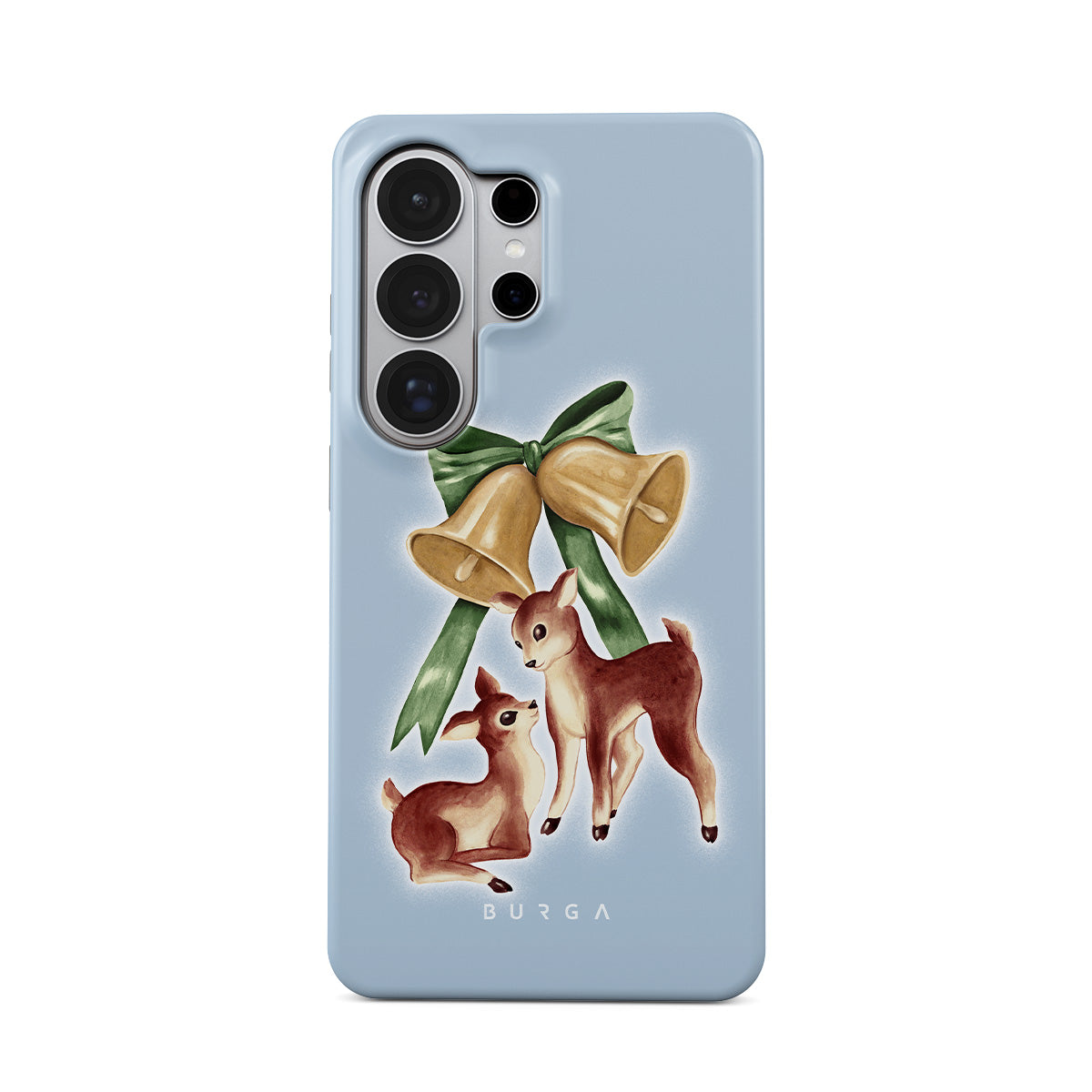 En este diseño: reno vintage, campanas de Navidad, campanas doradas, ilustración retro de reno, ciervo bebé, fondo azul claro