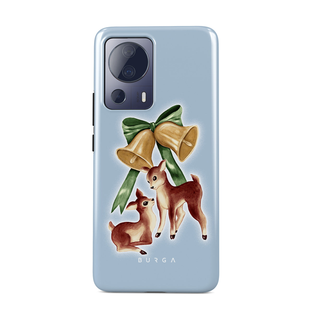 En este diseño: reno vintage, campanas de Navidad, campanas doradas, ilustración retro de reno, ciervo bebé, fondo azul claro