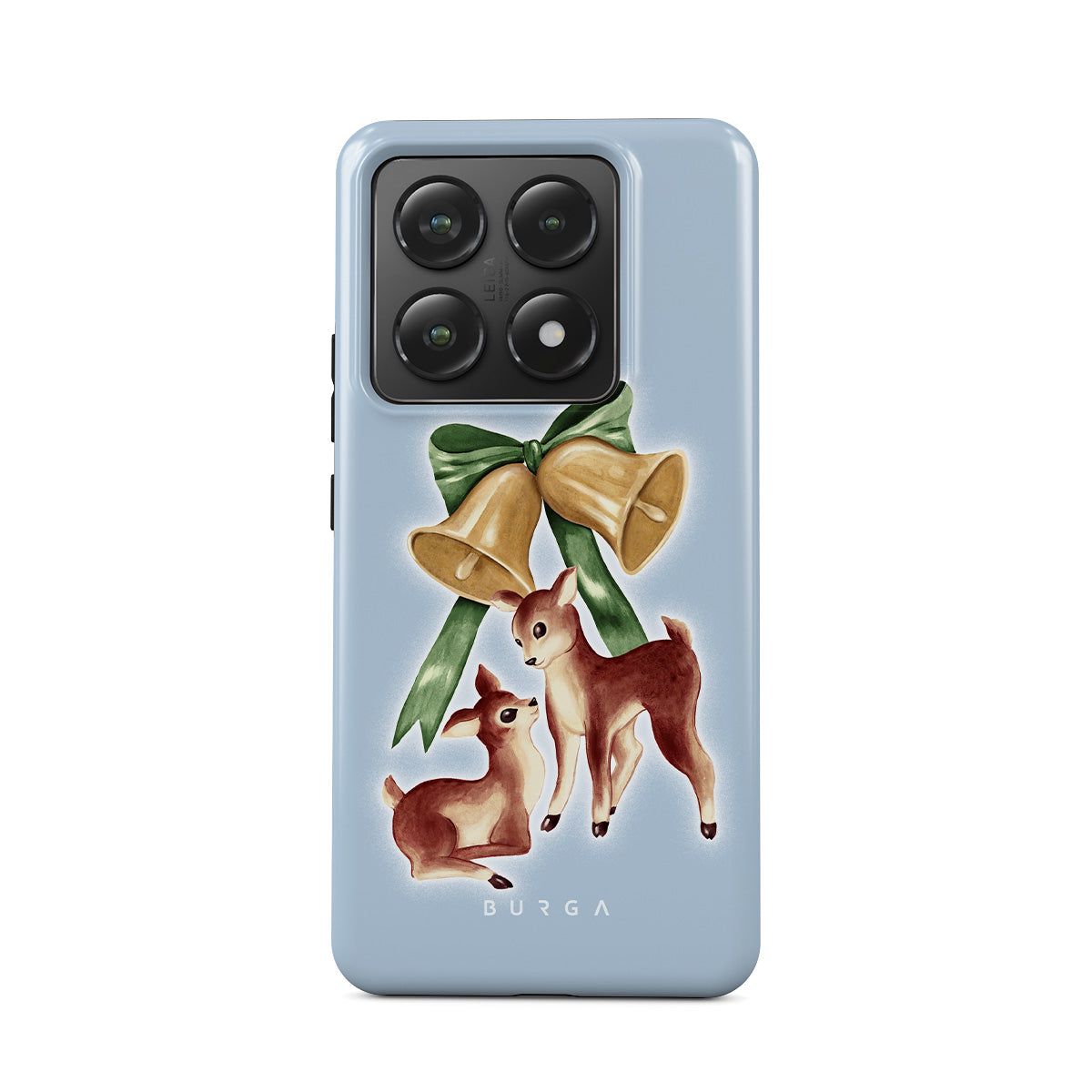 En este diseño: reno vintage, campanas de Navidad, campanas doradas, ilustración retro de reno, ciervo bebé, fondo azul claro