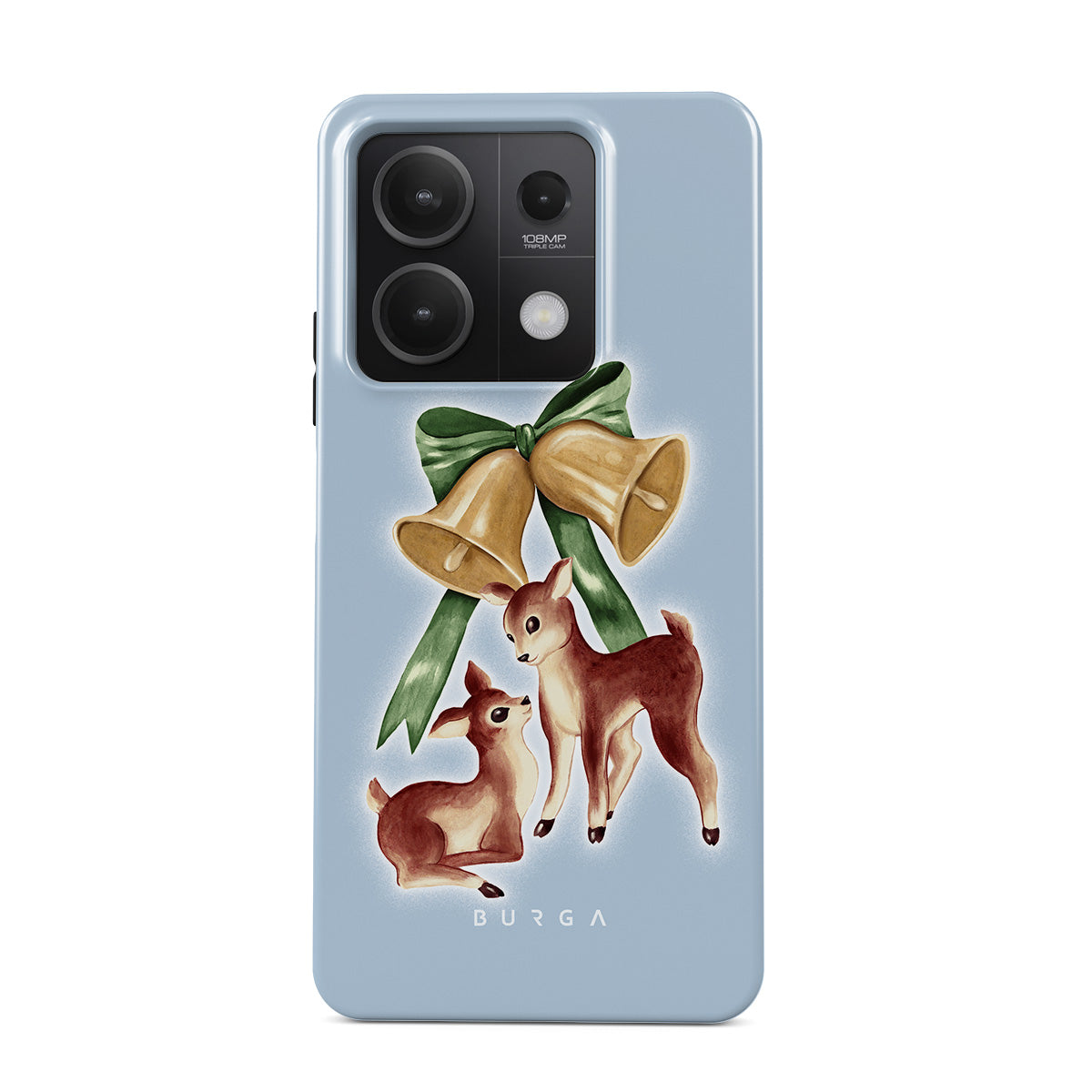 En este diseño: reno vintage, campanas de Navidad, campanas doradas, ilustración retro de reno, ciervo bebé, fondo azul claro