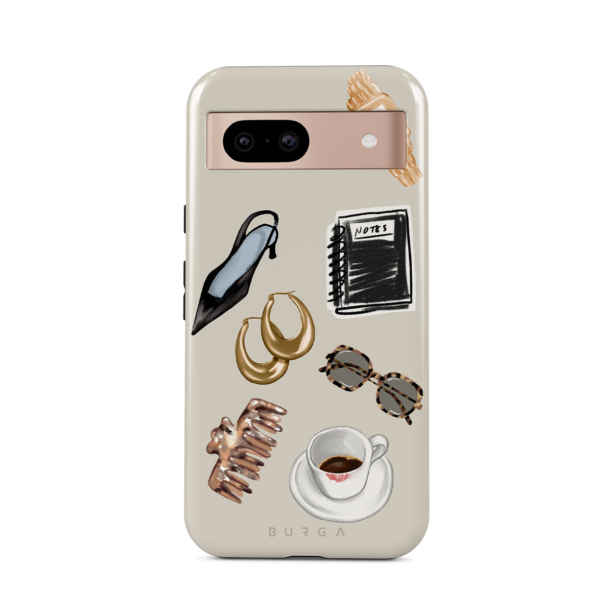 En este diseño: tacón negro, aros dorados, cuaderno negro, taza de café, lentes de carey, scrunchie marrón, reloj retro dorado.
