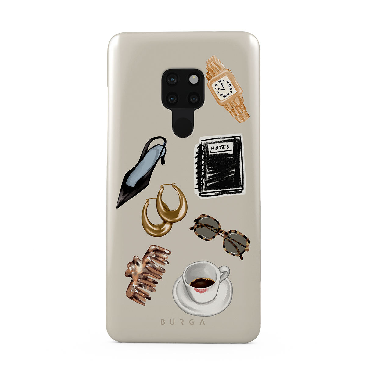 En este diseño: tacón negro, aros dorados, cuaderno negro, taza de café, lentes de carey, scrunchie marrón, reloj retro dorado.