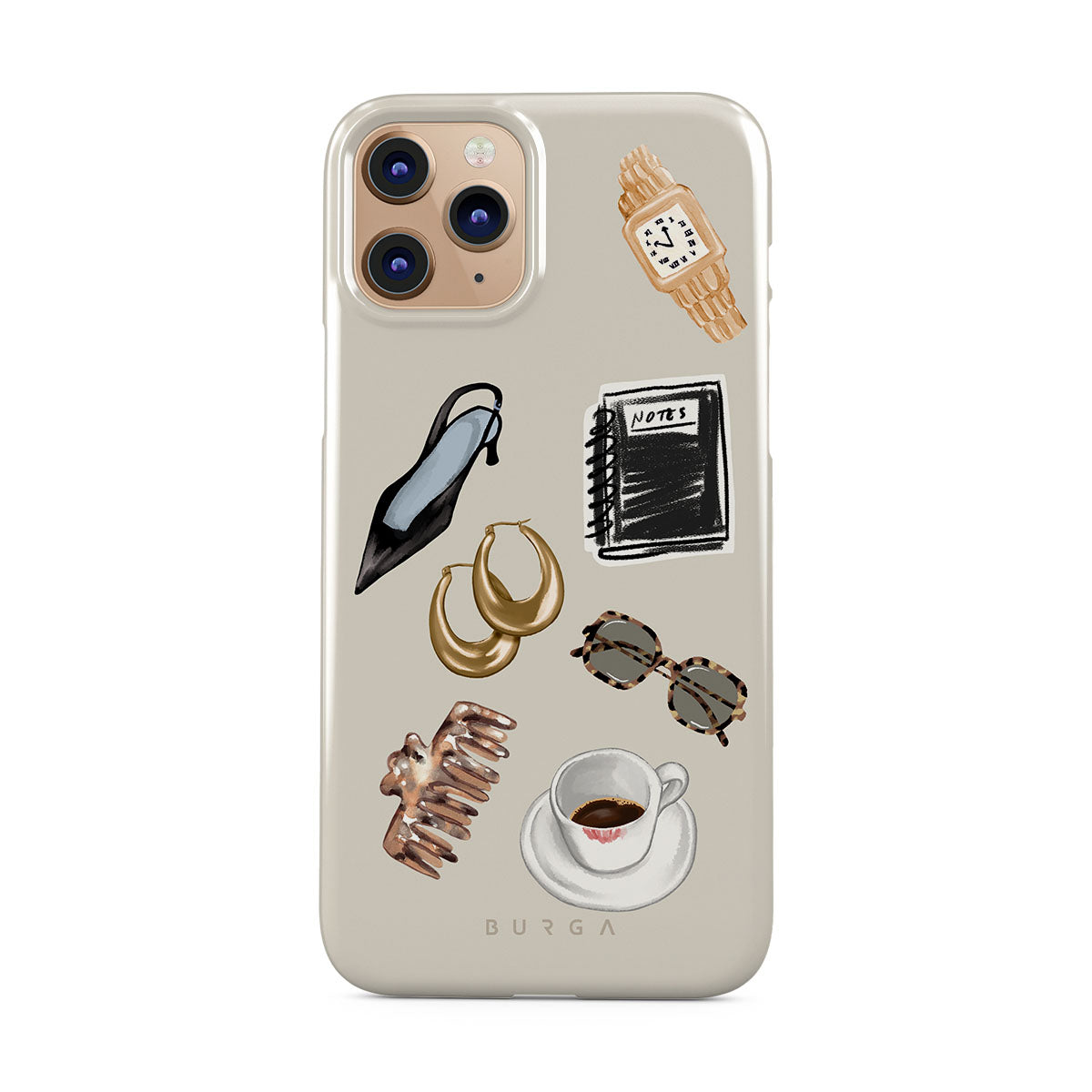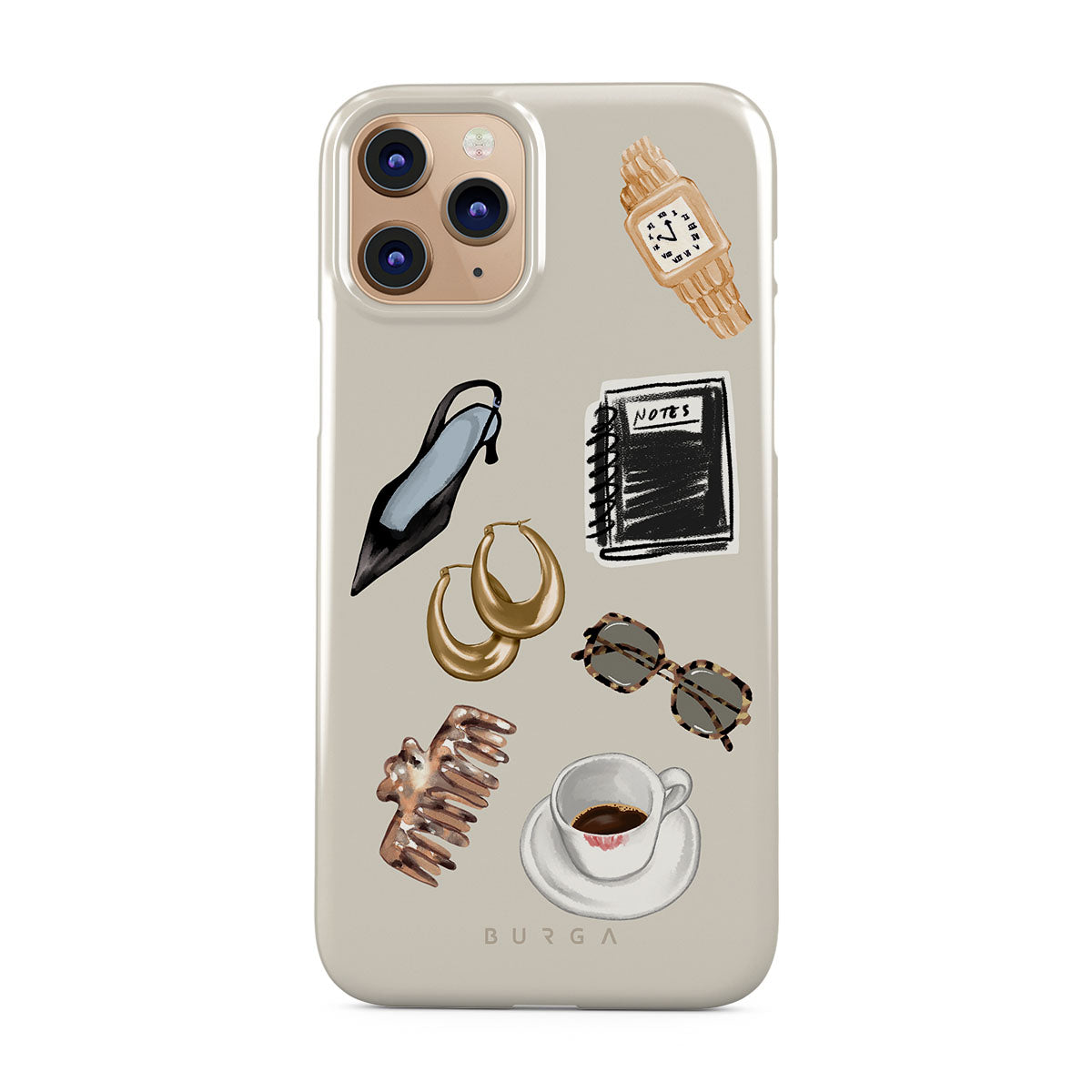 En este diseño: tacón negro, aros dorados, cuaderno negro, taza de café, lentes de carey, scrunchie marrón, reloj retro dorado.
