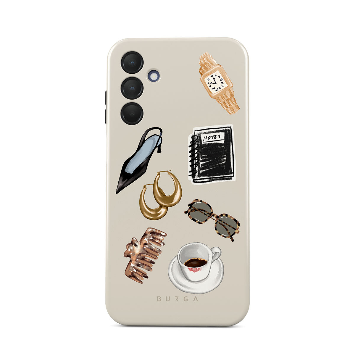 En este diseño: tacón negro, aros dorados, cuaderno negro, taza de café, lentes de carey, scrunchie marrón, reloj retro dorado.