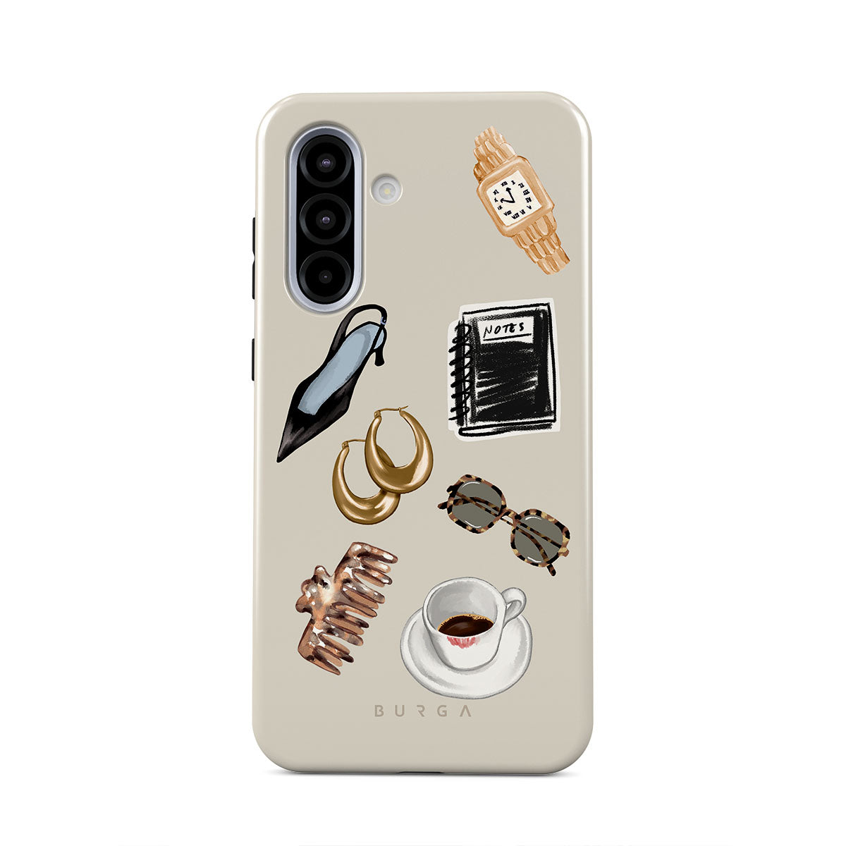 En este diseño: tacón negro, aros dorados, cuaderno negro, taza de café, lentes de carey, scrunchie marrón, reloj retro dorado.