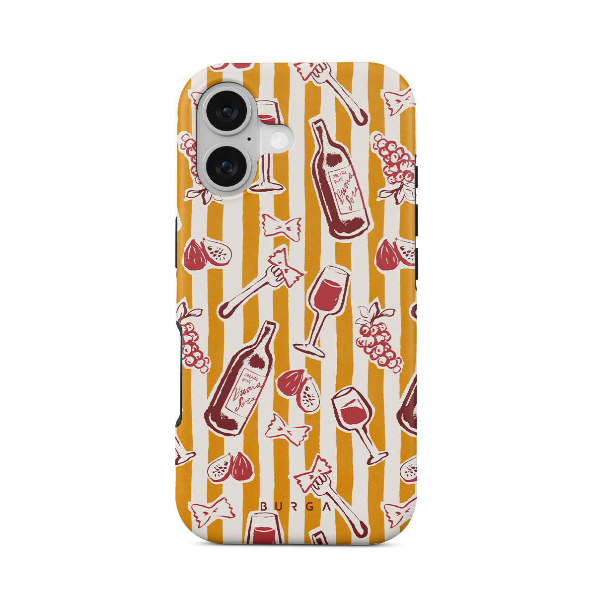 En este diseño: frutas, higos, uvas, tenedores, pasta, vino, copa, rayas.
