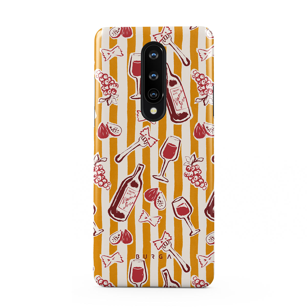 En este diseño: frutas, higos, uvas, tenedores, pasta, vino, copa, rayas.