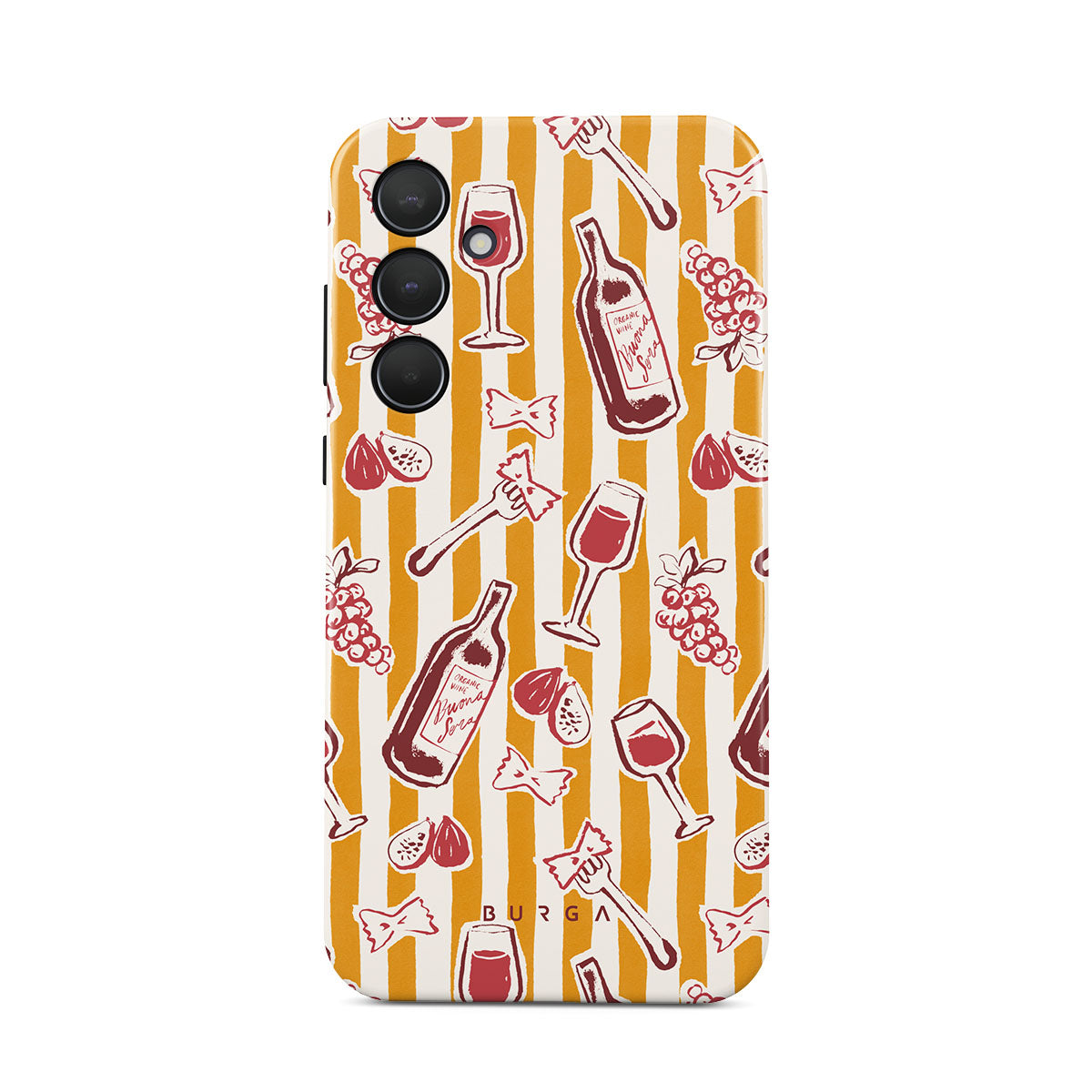 En este diseño: frutas, higos, uvas, tenedores, pasta, vino, copa, rayas.