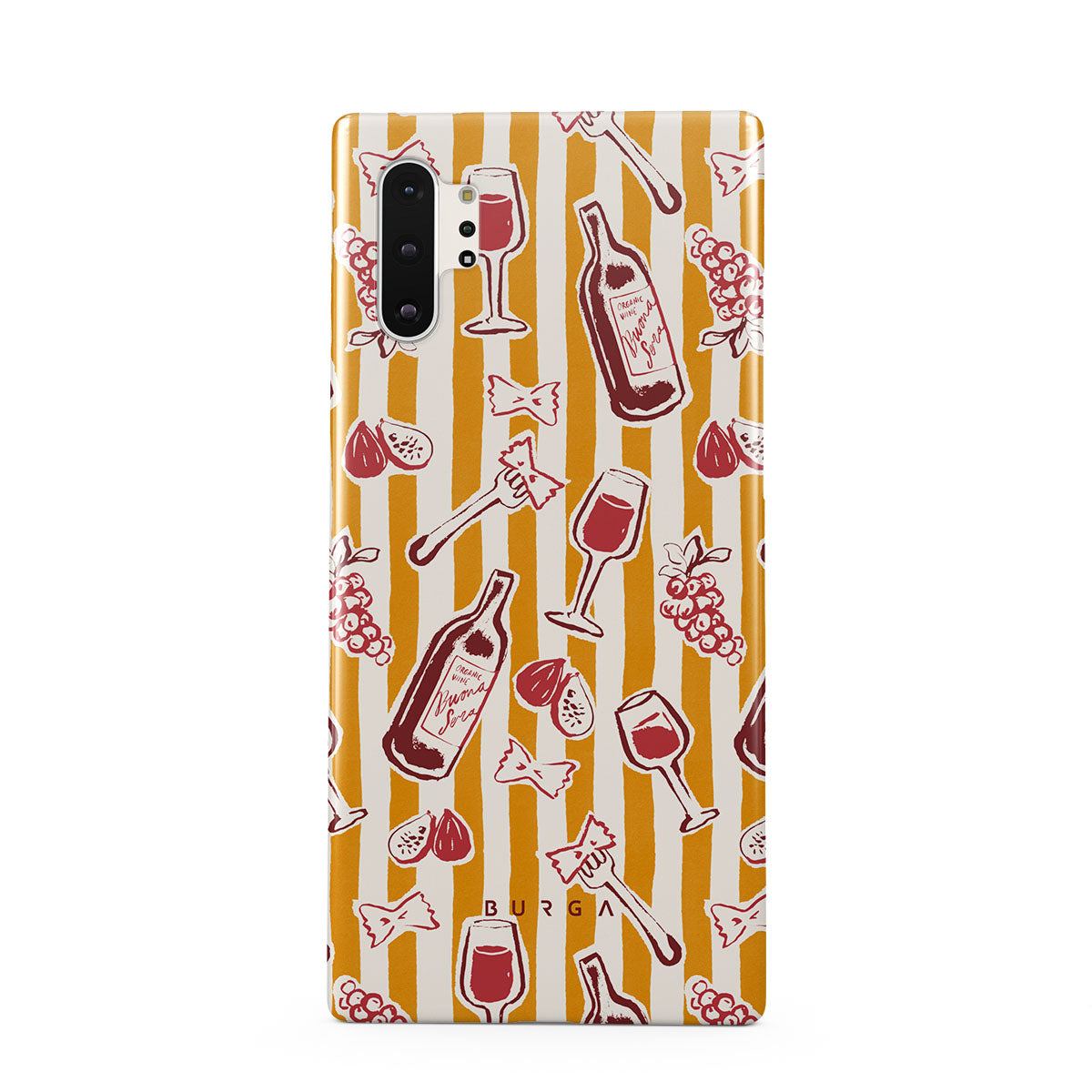 En este diseño: frutas, higos, uvas, tenedores, pasta, vino, copa, rayas.