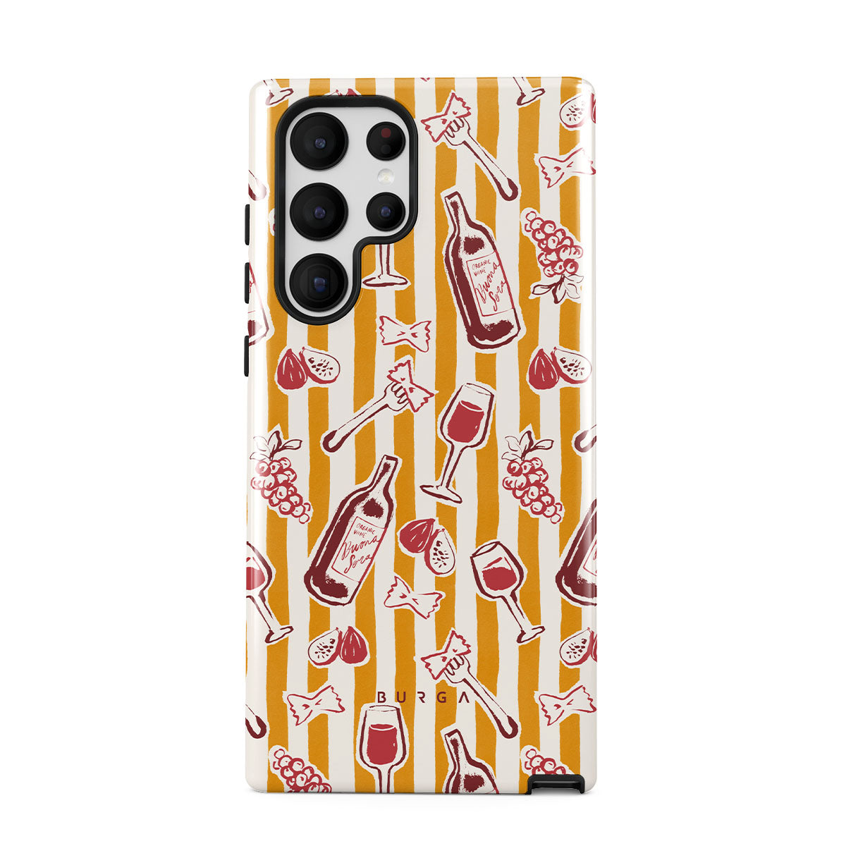 En este diseño: frutas, higos, uvas, tenedores, pasta, vino, copa, rayas.