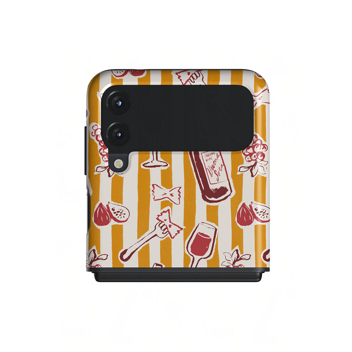 En este diseño: frutas, higos, uvas, tenedores, pasta, vino, copa, rayas.