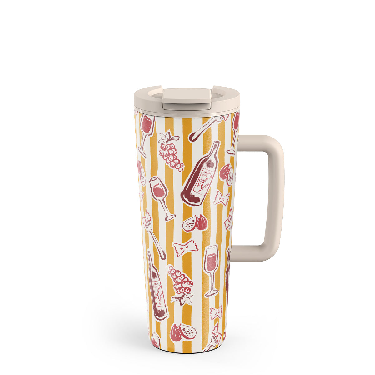 En este diseño: frutas, higos, uvas, tenedores, pasta, vino, copa, rayas.
