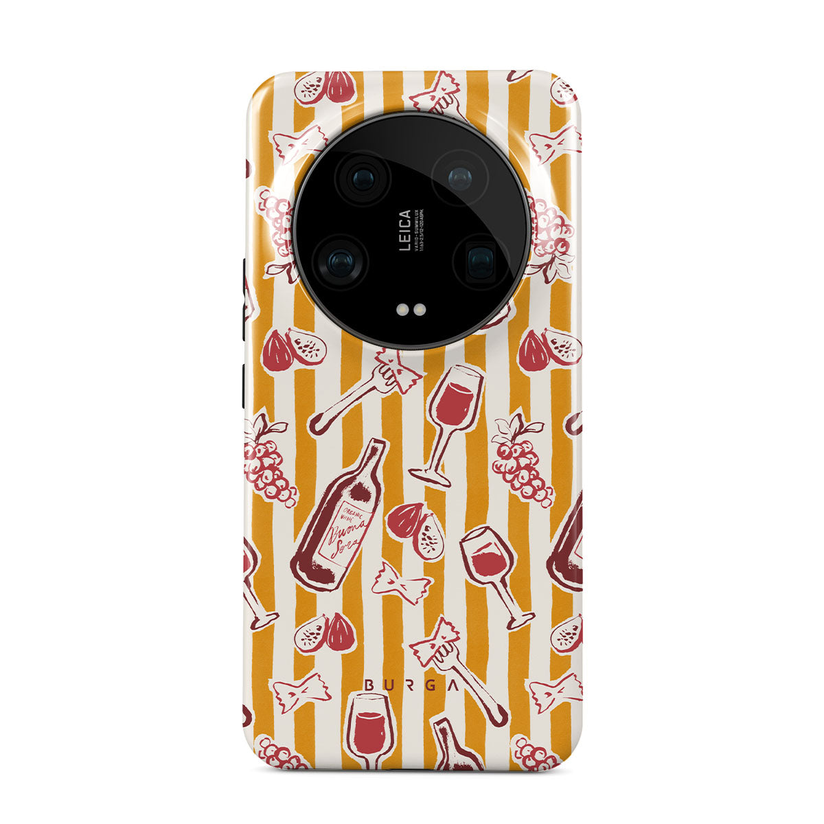 En este diseño: frutas, higos, uvas, tenedores, pasta, vino, copa, rayas.