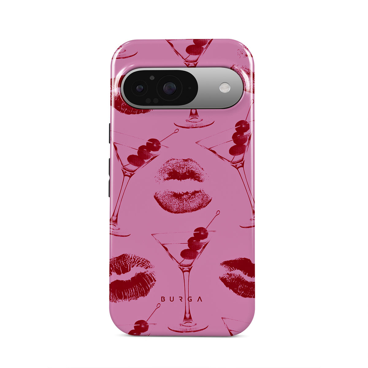 Este diseño presenta: labios rojos, besos, copas de cóctel, martinis.