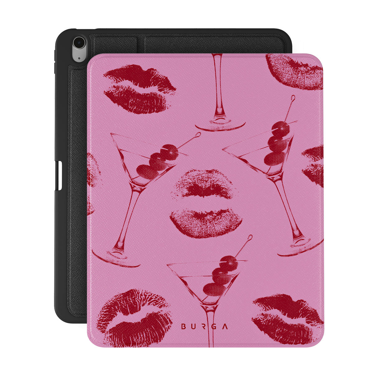 Este diseño presenta: labios rojos, besos, copas de cóctel, martinis.