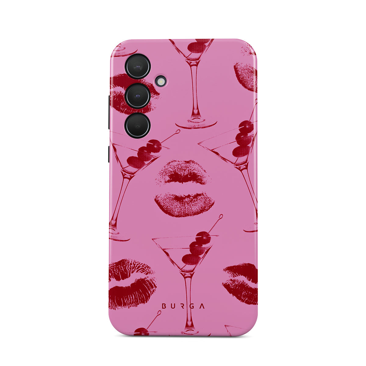 Este diseño presenta: labios rojos, besos, copas de cóctel, martinis.