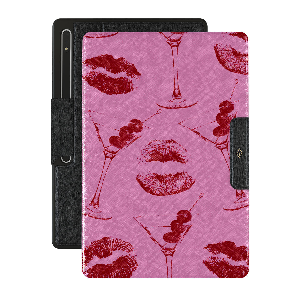 Este diseño presenta: labios rojos, besos, copas de cóctel, martinis.
