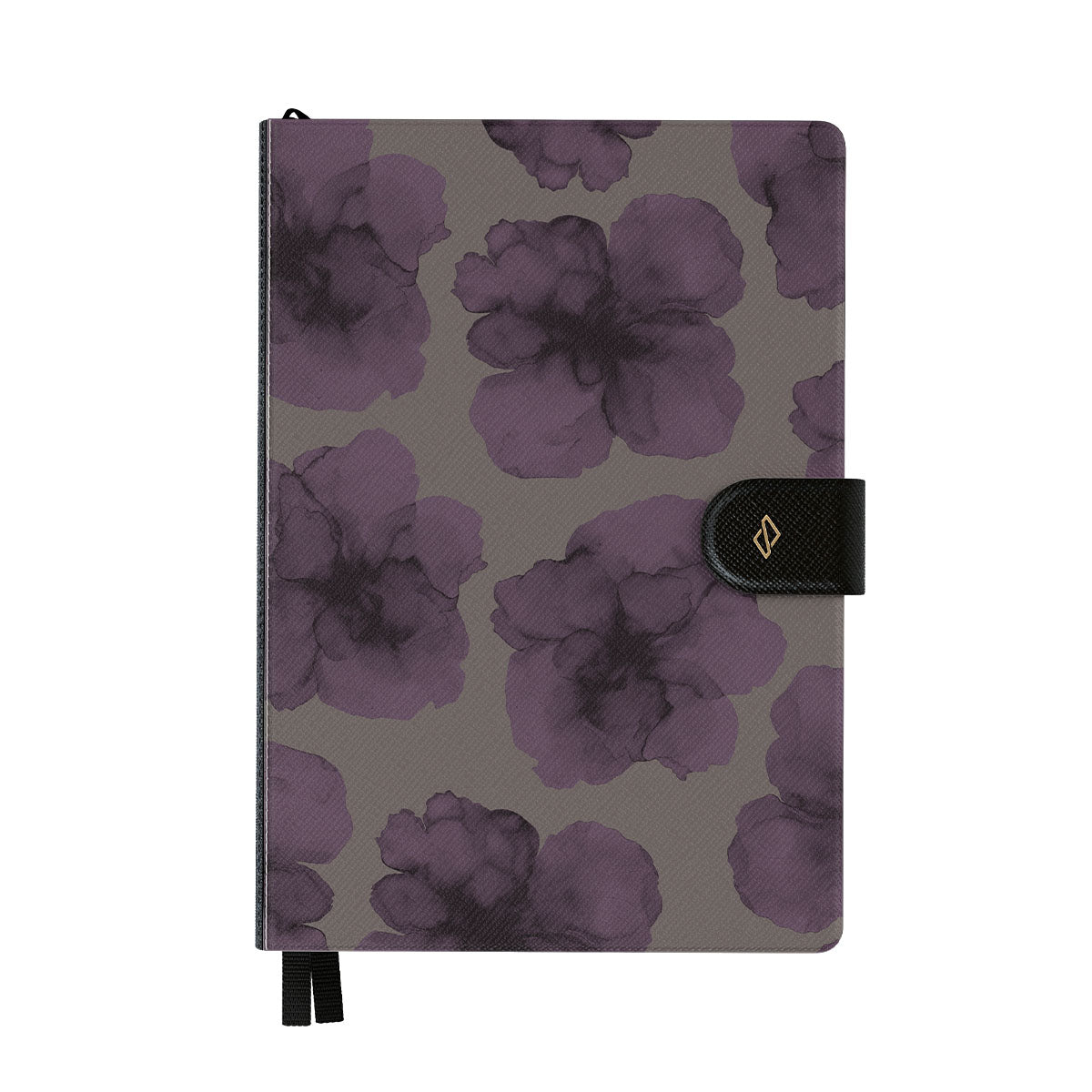 En este diseño: flores oscuras, flores moradas, pétalos violetas.