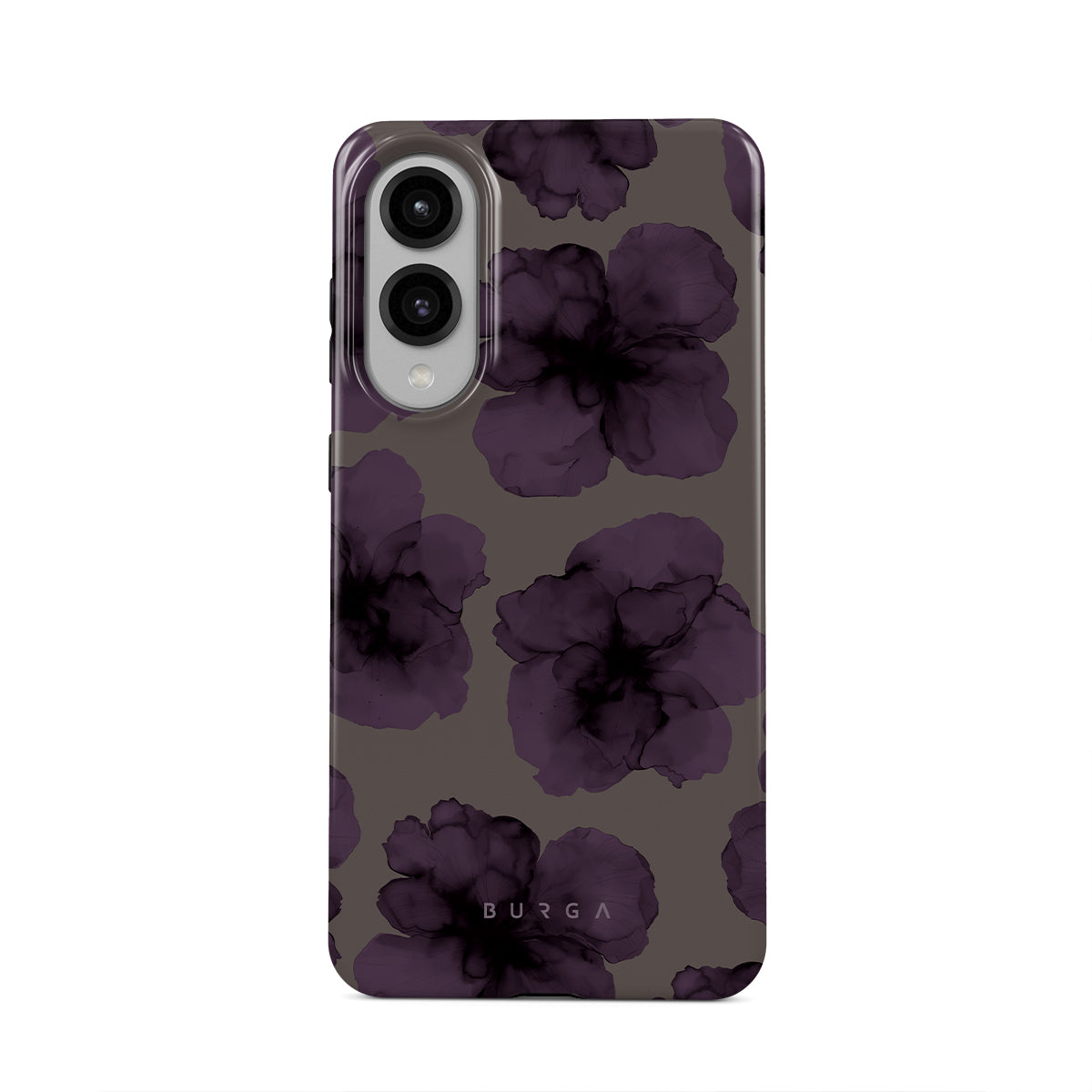 En este diseño: flores oscuras, flores moradas, pétalos violetas.