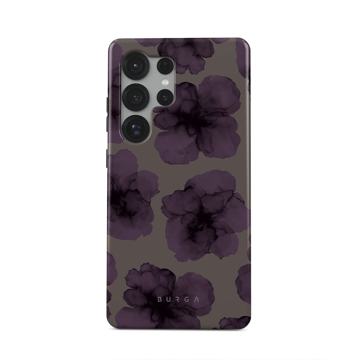 En este diseño: flores oscuras, flores moradas, pétalos violetas.