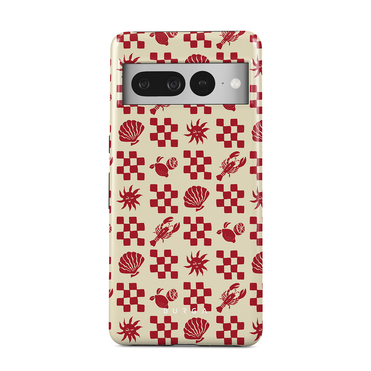 En este diseño: patrones de cuadros rojos, conchas, langosta, motivos italianos.