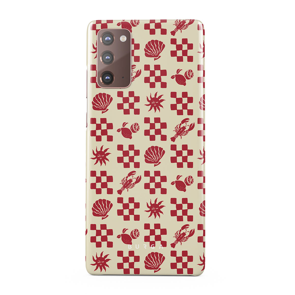 En este diseño: patrones de cuadros rojos, conchas, langosta, motivos italianos.
