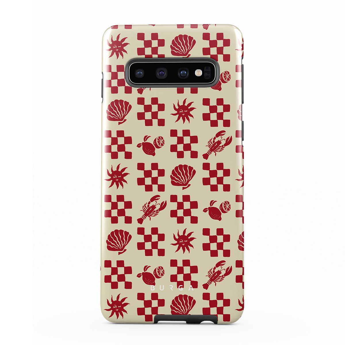 En este diseño: patrones de cuadros rojos, conchas, langosta, motivos italianos.