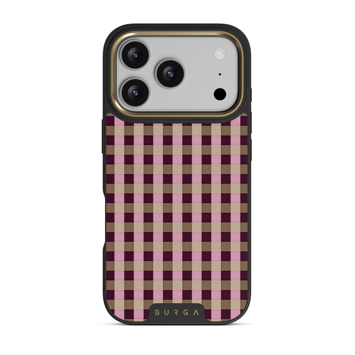 En este diseño: un patrón de cuadros rosa y burdeos en estilo moderno.