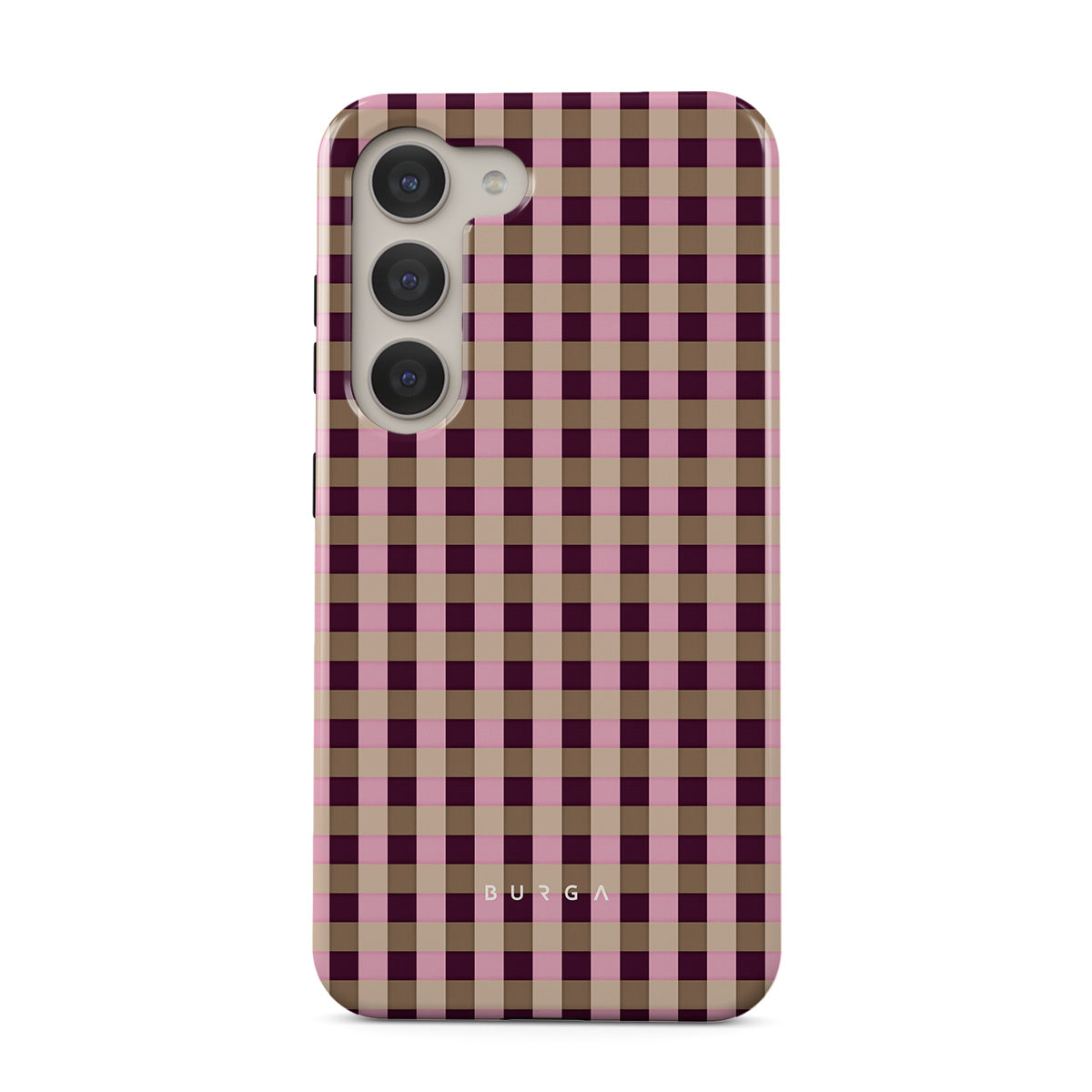 En este diseño: un patrón de cuadros rosa y burdeos en estilo moderno.