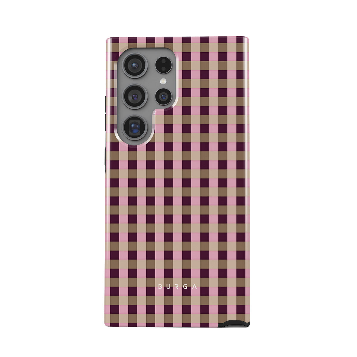 En este diseño: un patrón de cuadros rosa y burdeos en estilo moderno.