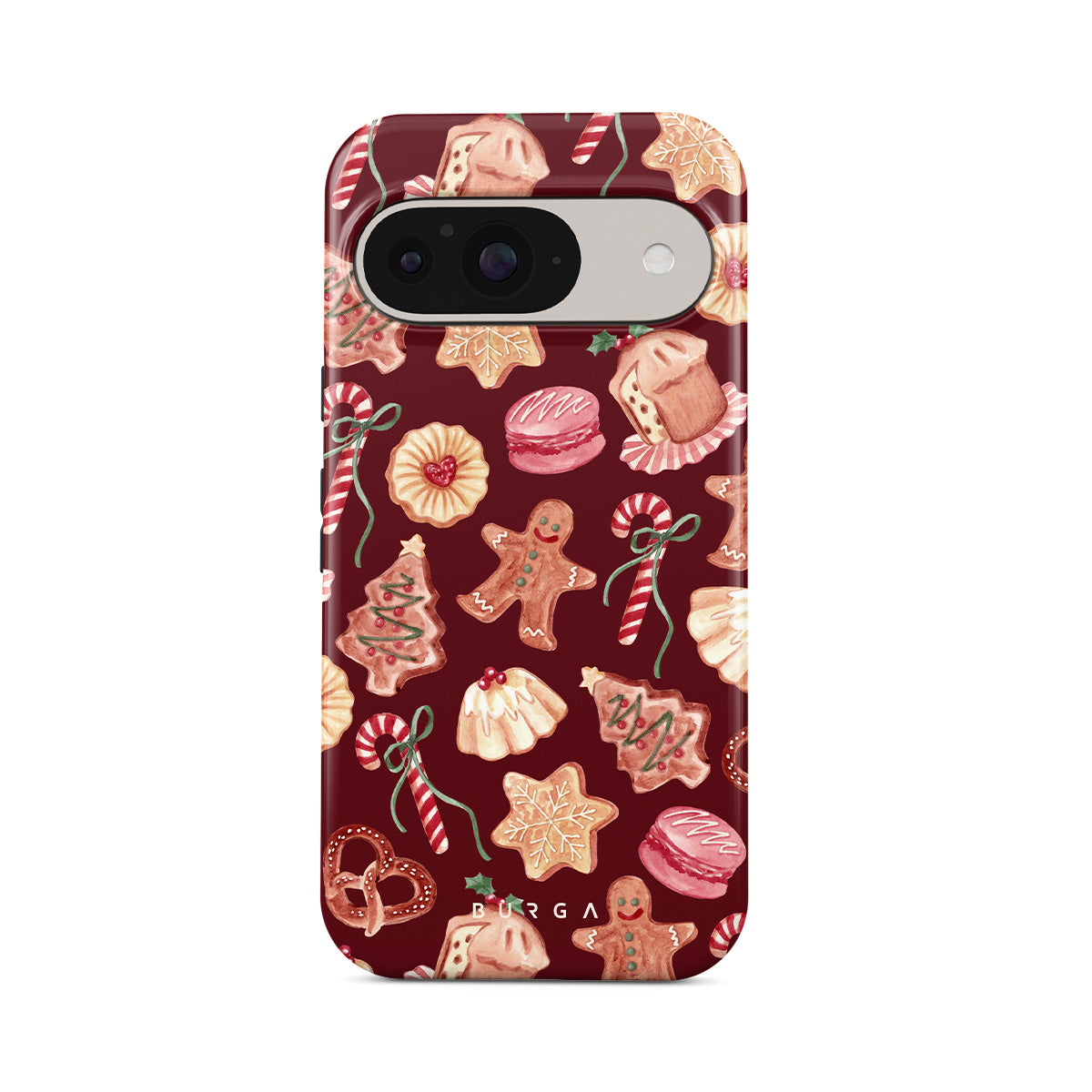 En este diseño: galletas de Navidad, hombres de jengibre, bastones de caramelo, caramelos de menta, dulces festivos, fondo rojo burdeos
