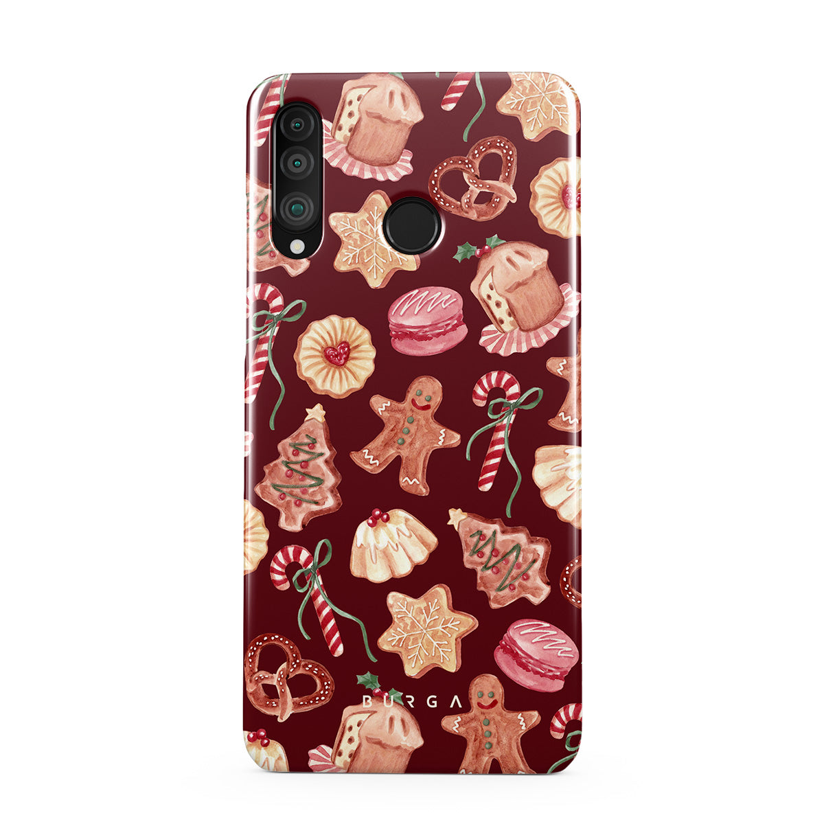 En este diseño: galletas de Navidad, hombres de jengibre, bastones de caramelo, caramelos de menta, dulces festivos, fondo rojo burdeos
