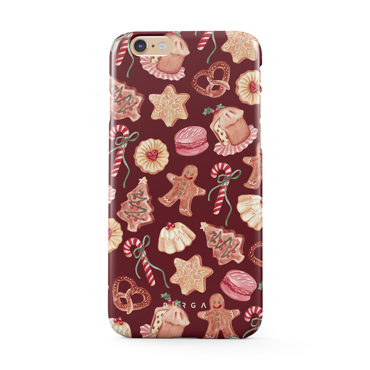 En este diseño: galletas de Navidad, hombres de jengibre, bastones de caramelo, caramelos de menta, dulces festivos, fondo rojo burdeos