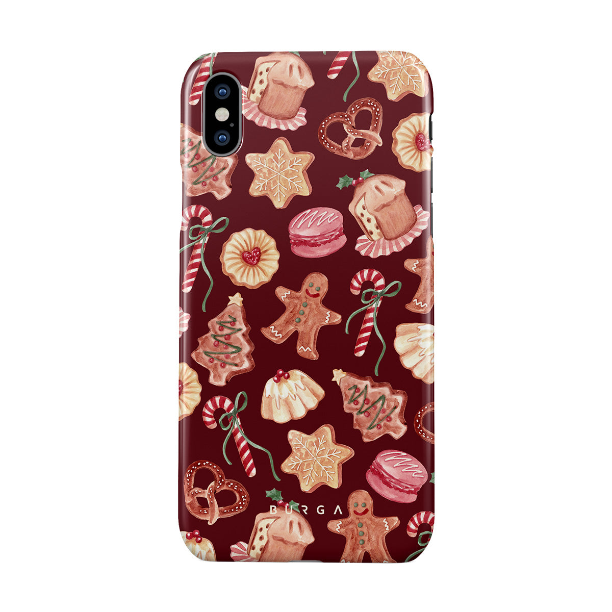 En este diseño: galletas de Navidad, hombres de jengibre, bastones de caramelo, caramelos de menta, dulces festivos, fondo rojo burdeos