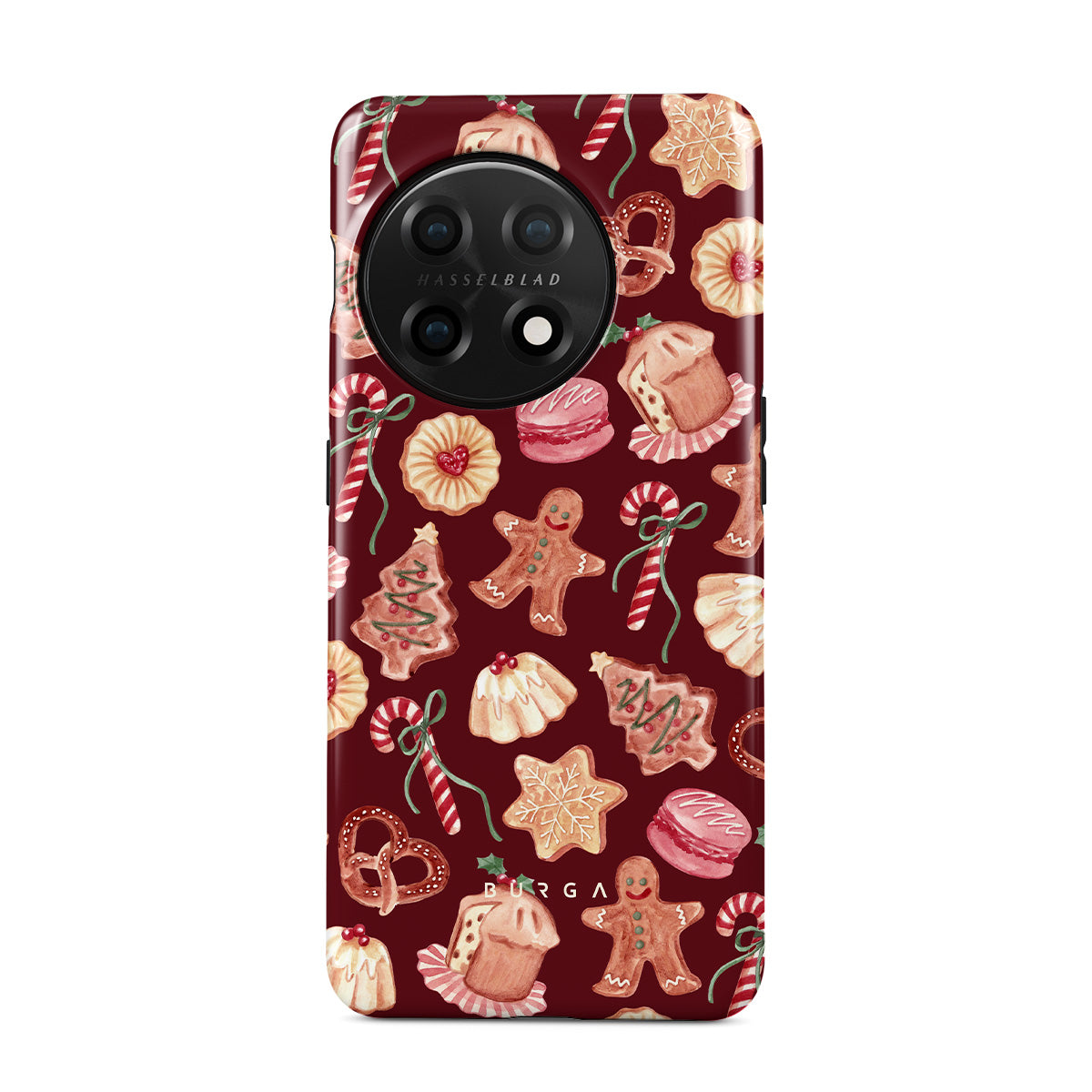 En este diseño: galletas de Navidad, hombres de jengibre, bastones de caramelo, caramelos de menta, dulces festivos, fondo rojo burdeos