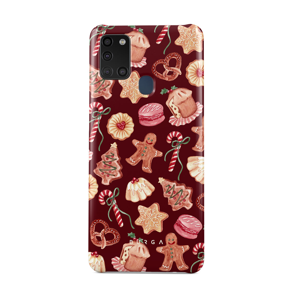 En este diseño: galletas de Navidad, hombres de jengibre, bastones de caramelo, caramelos de menta, dulces festivos, fondo rojo burdeos