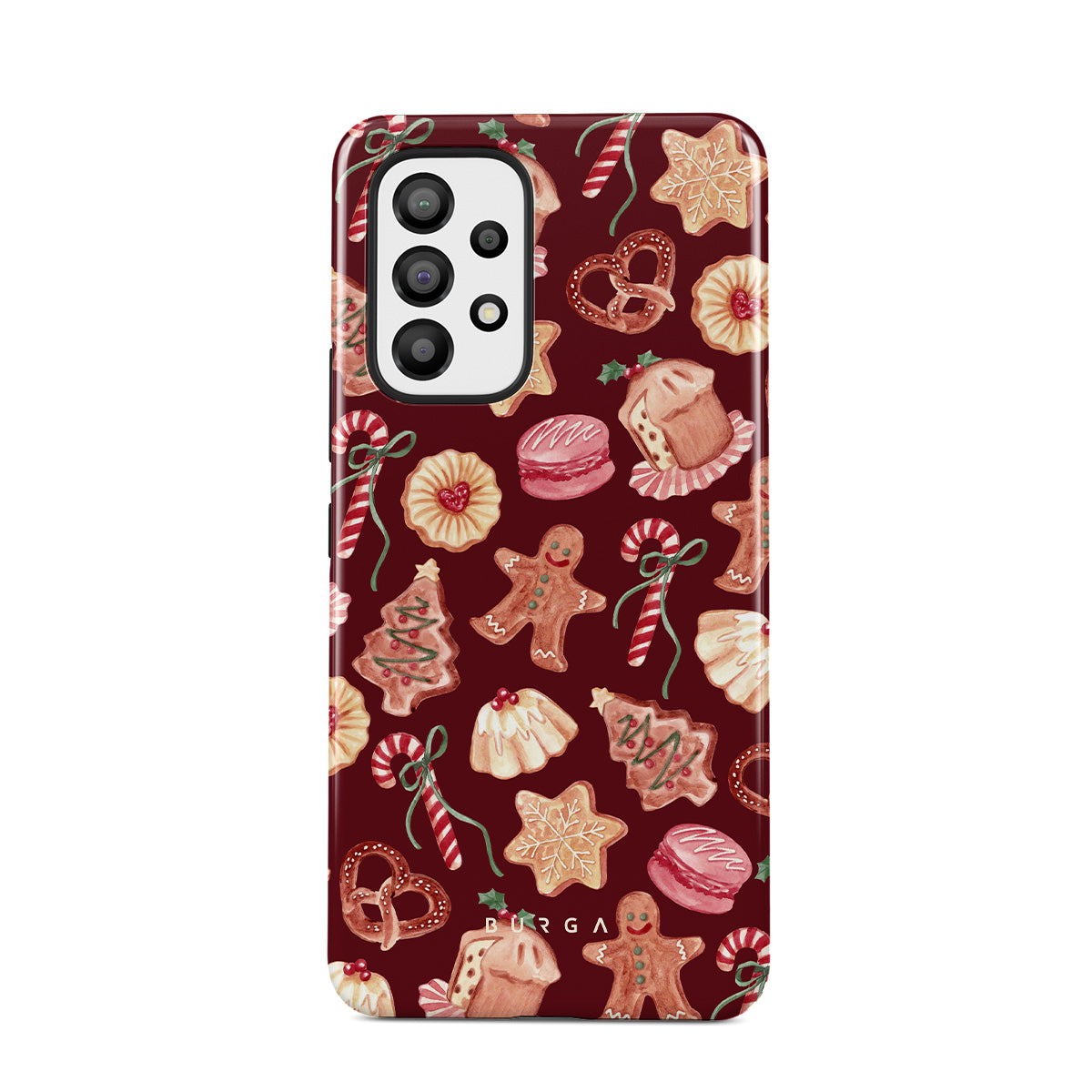 En este diseño: galletas de Navidad, hombres de jengibre, bastones de caramelo, caramelos de menta, dulces festivos, fondo rojo burdeos
