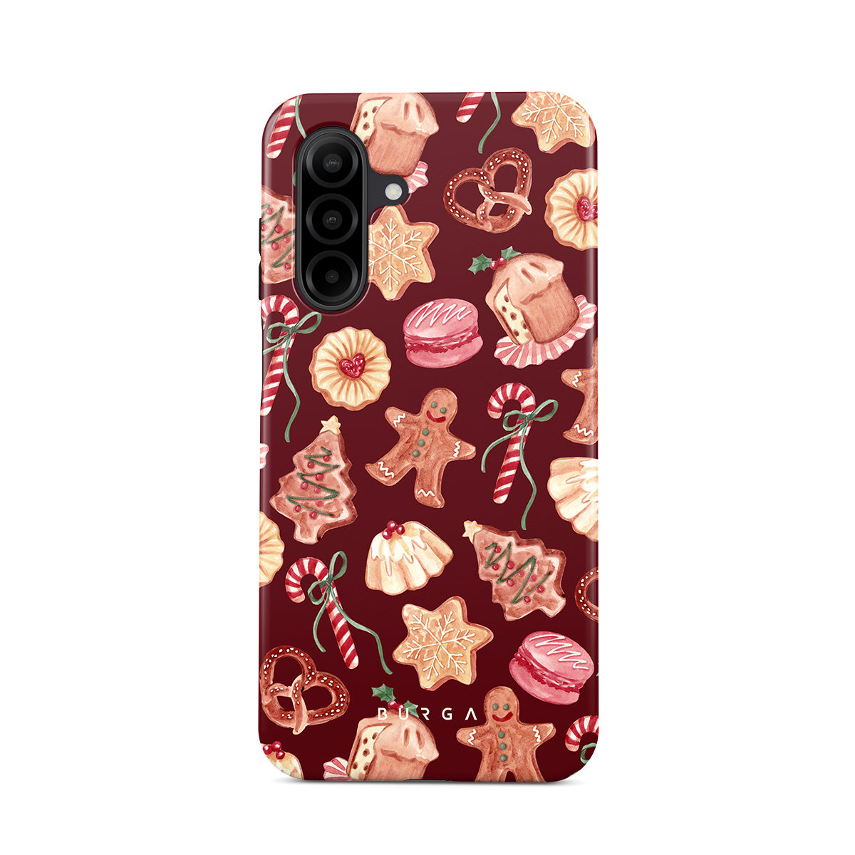 En este diseño: galletas de Navidad, hombres de jengibre, bastones de caramelo, caramelos de menta, dulces festivos, fondo rojo burdeos