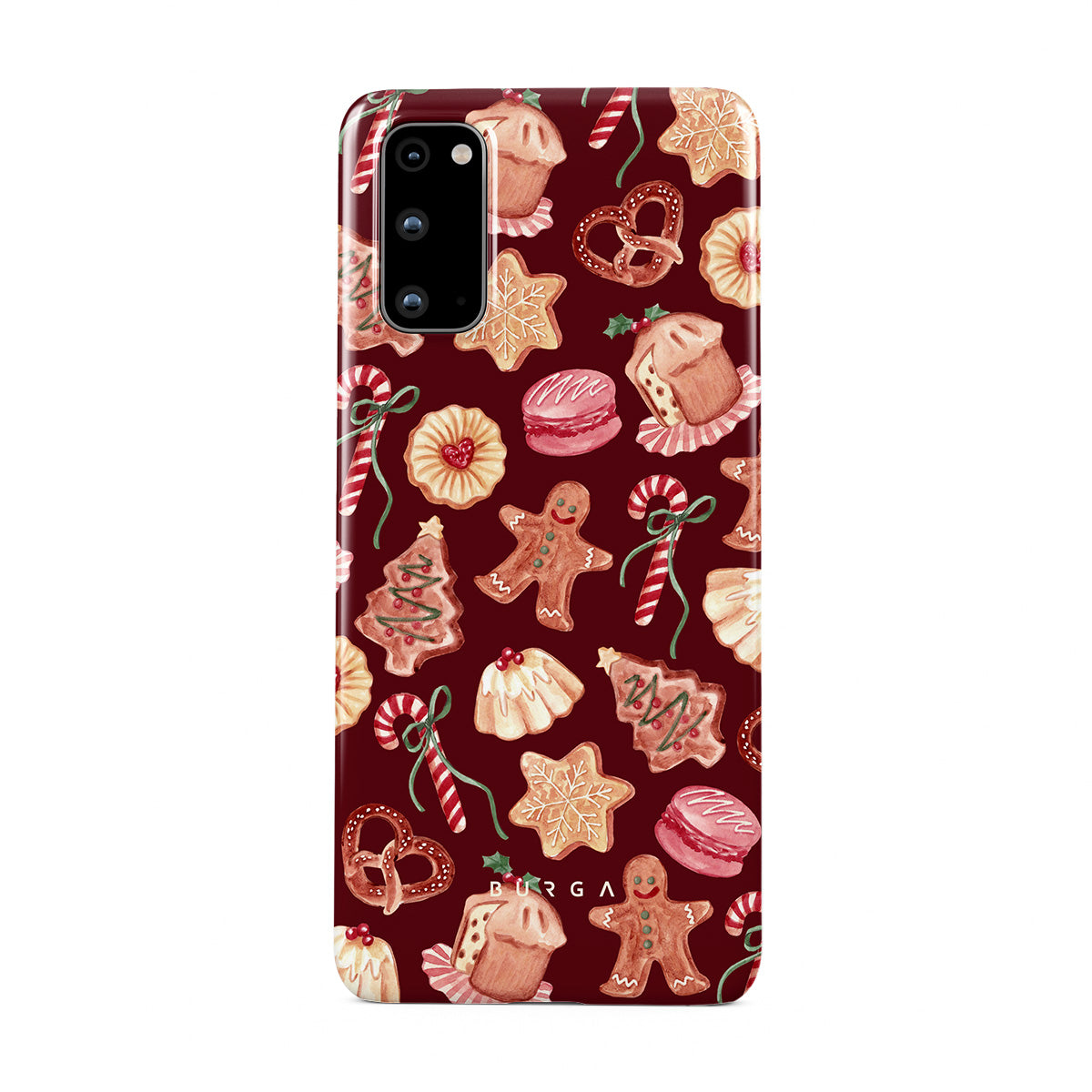 En este diseño: galletas de Navidad, hombres de jengibre, bastones de caramelo, caramelos de menta, dulces festivos, fondo rojo burdeos