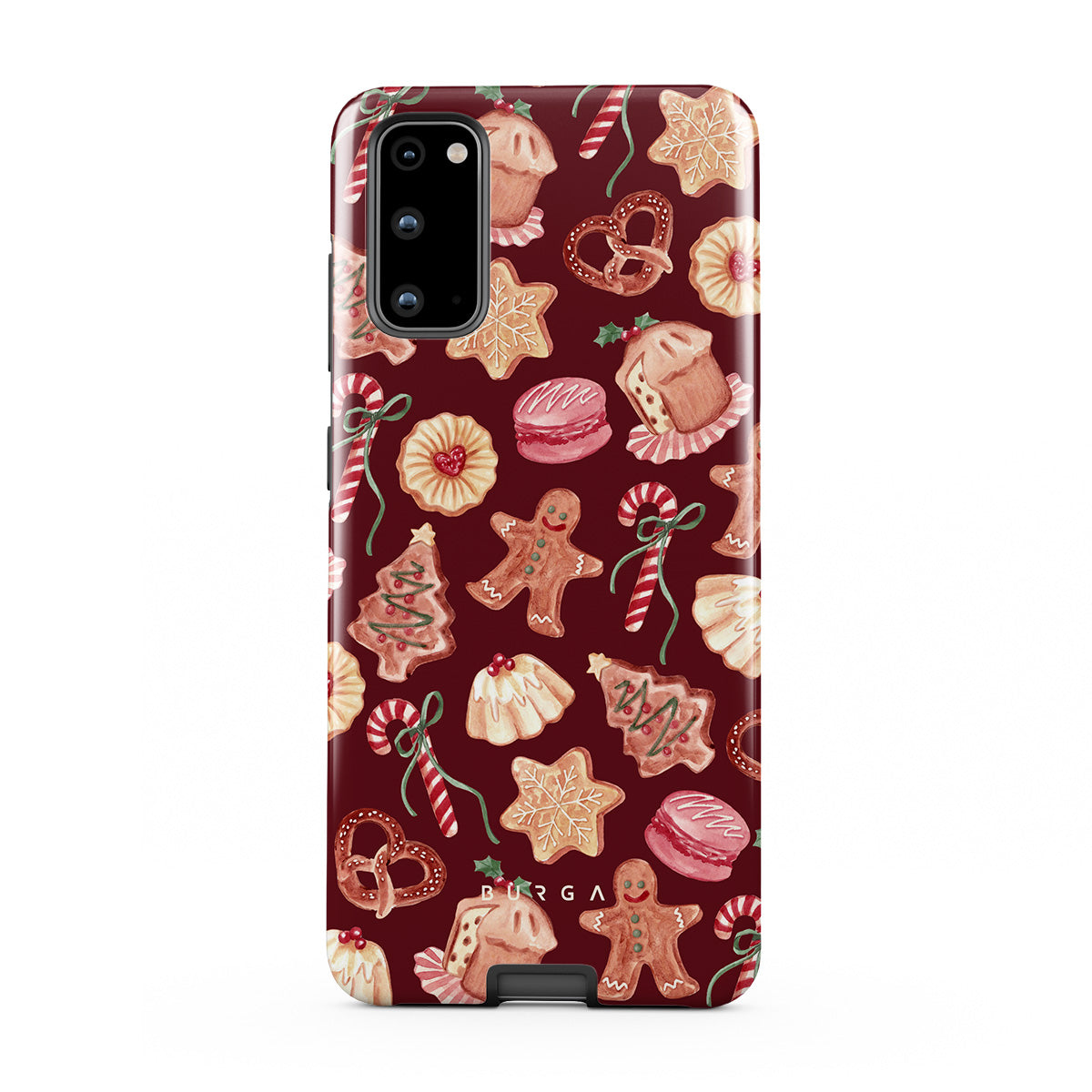 En este diseño: galletas de Navidad, hombres de jengibre, bastones de caramelo, caramelos de menta, dulces festivos, fondo rojo burdeos