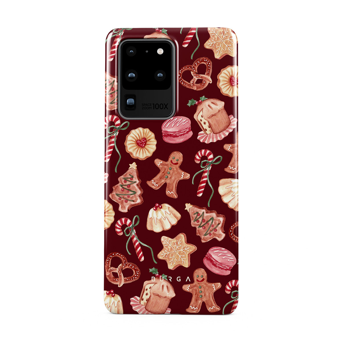 En este diseño: galletas de Navidad, hombres de jengibre, bastones de caramelo, caramelos de menta, dulces festivos, fondo rojo burdeos