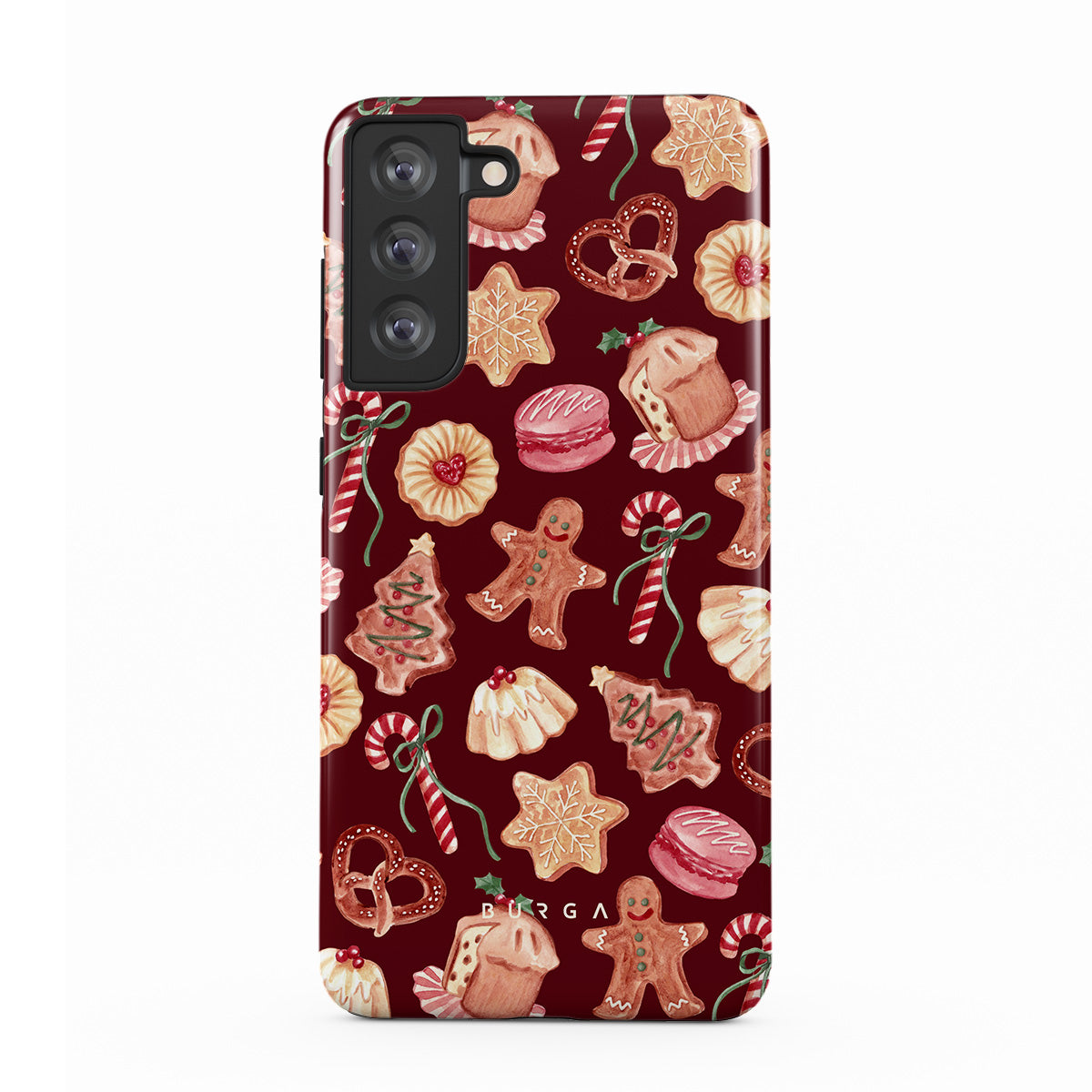 En este diseño: galletas de Navidad, hombres de jengibre, bastones de caramelo, caramelos de menta, dulces festivos, fondo rojo burdeos