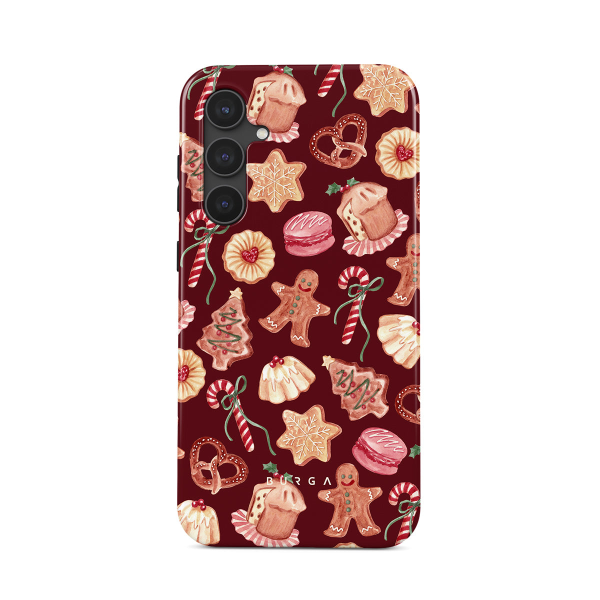 En este diseño: galletas de Navidad, hombres de jengibre, bastones de caramelo, caramelos de menta, dulces festivos, fondo rojo burdeos