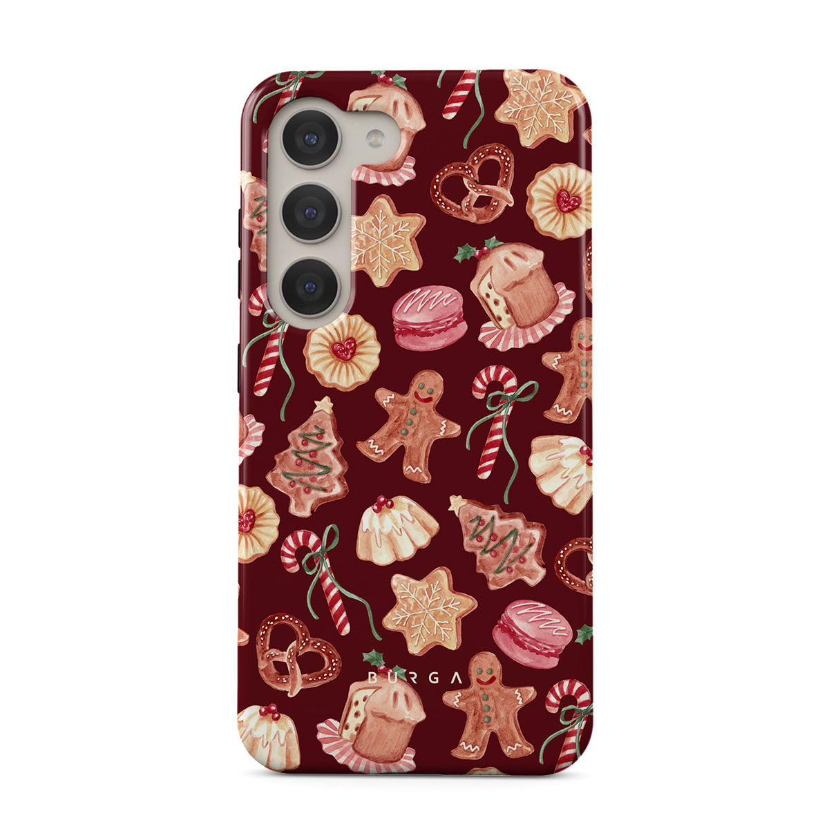 En este diseño: galletas de Navidad, hombres de jengibre, bastones de caramelo, caramelos de menta, dulces festivos, fondo rojo burdeos