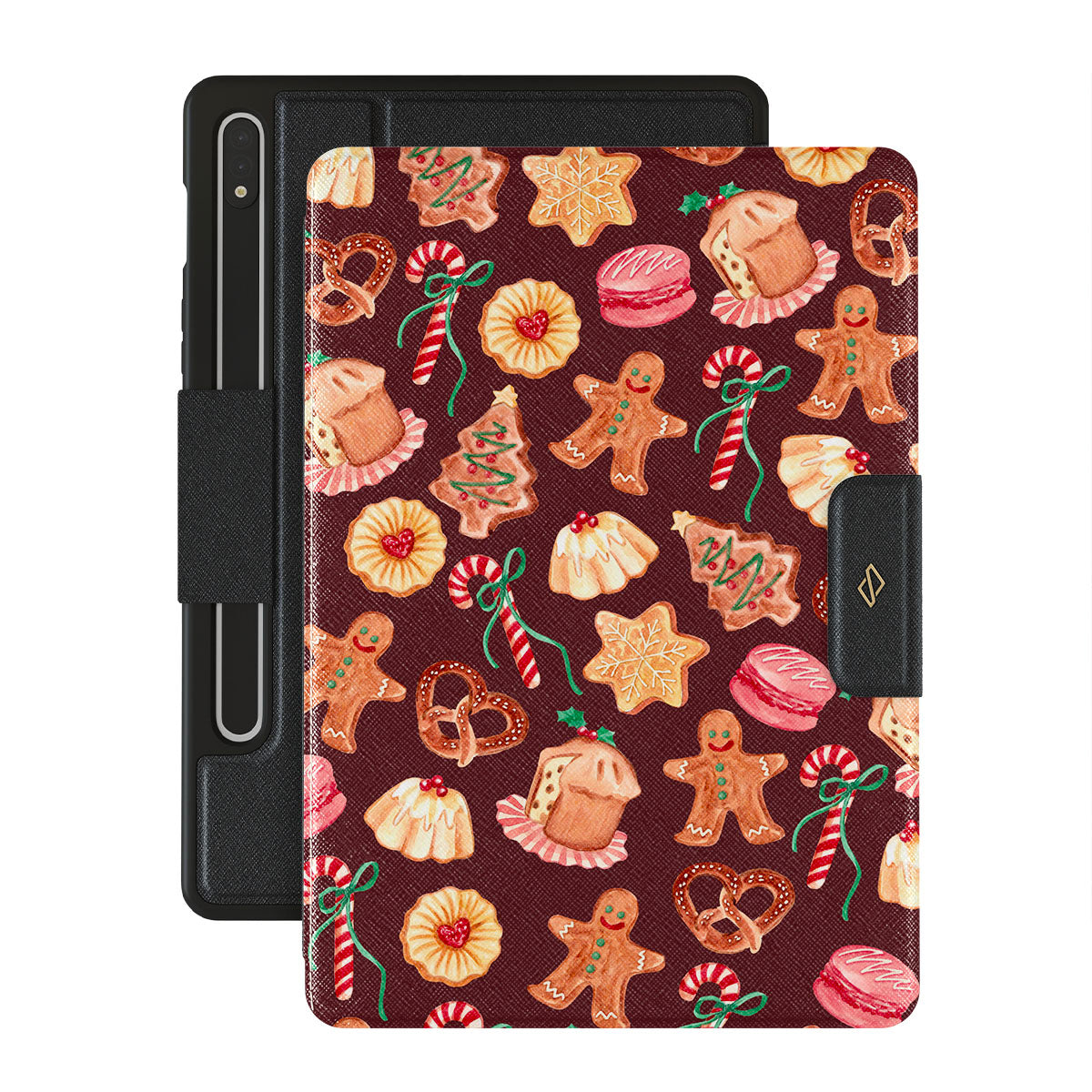 En este diseño: galletas de Navidad, hombres de jengibre, bastones de caramelo, caramelos de menta, dulces festivos, fondo rojo burdeos