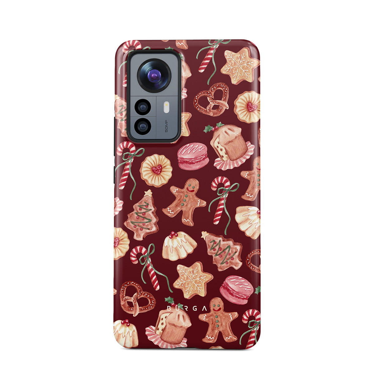 En este diseño: galletas de Navidad, hombres de jengibre, bastones de caramelo, caramelos de menta, dulces festivos, fondo rojo burdeos
