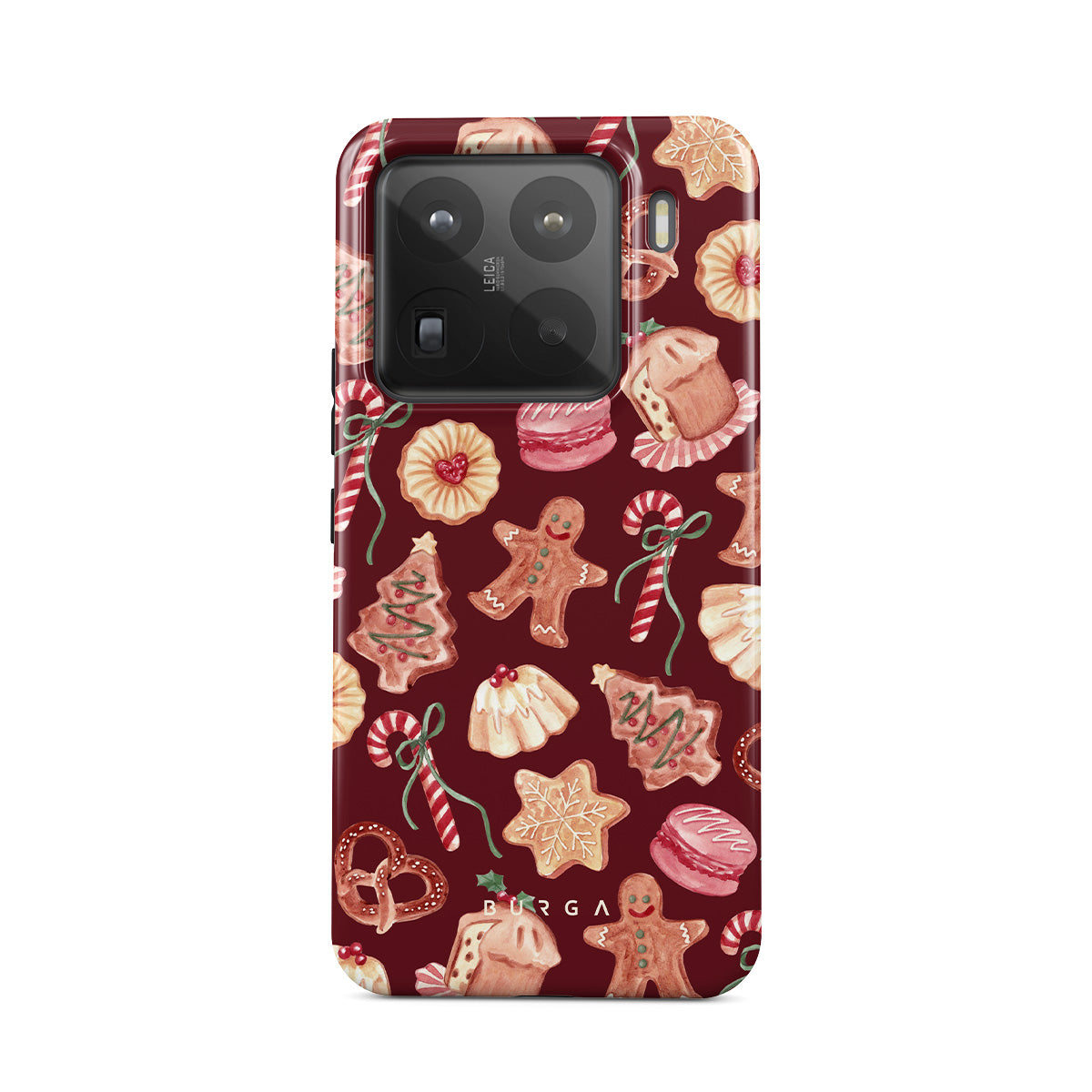 En este diseño: galletas de Navidad, hombres de jengibre, bastones de caramelo, caramelos de menta, dulces festivos, fondo rojo burdeos